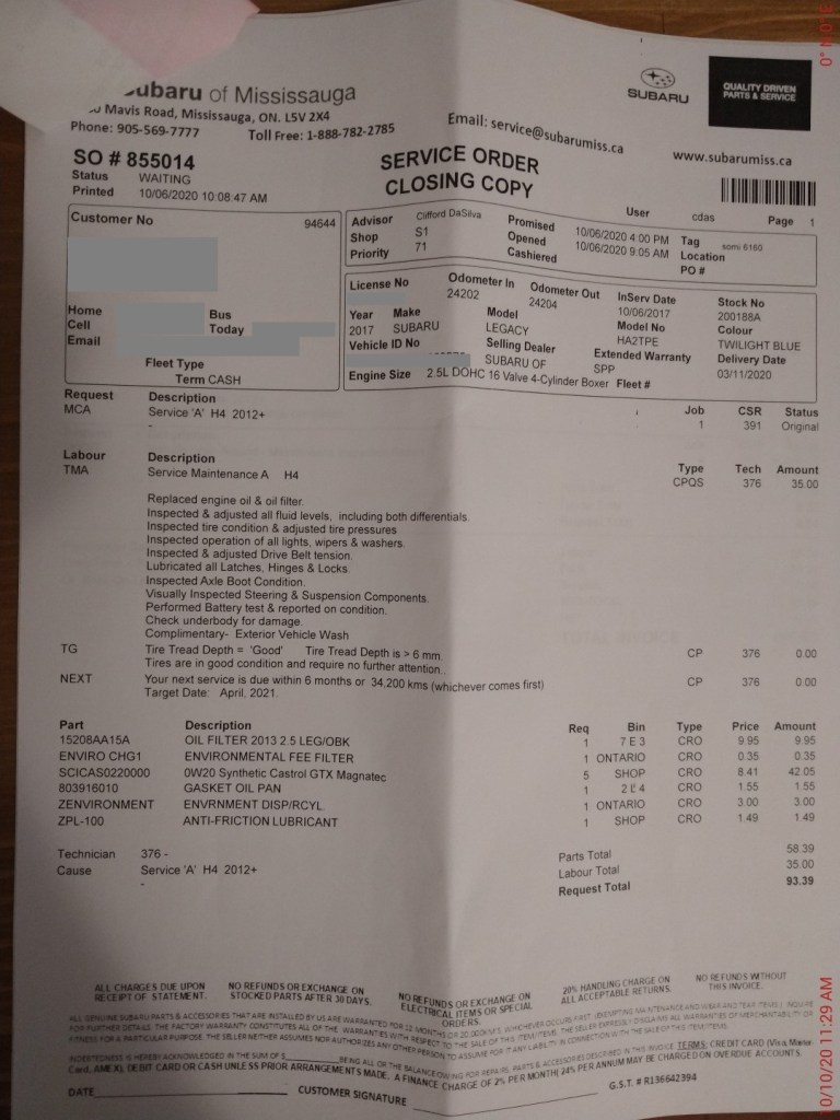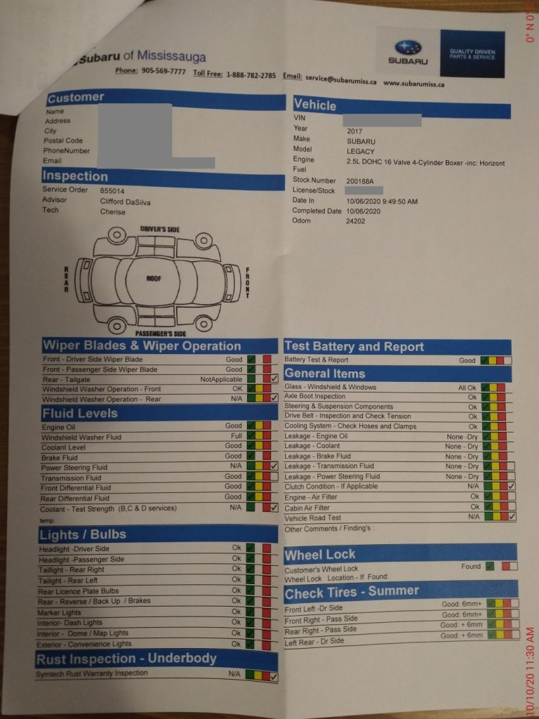 Chụp lại giấy tờ khi đem xe đi kiểm tra định kỳ tại dealer. Mình không biết gì nên ‘phó thác’ vô họ vậy. Tổng chi phí $105, mất chừng 2 tiếng.