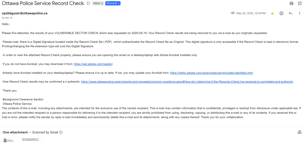 Bước 1: Trường email file PDF “Request for a Vulnerable Sector Police Check”